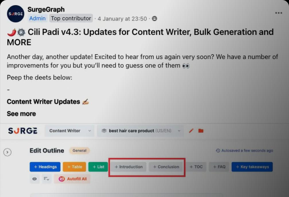 At SurgeGraph, we like to hit the ground running. We value speed and efficiency (evidenced by our launch of 102 updates in just 8 months!).