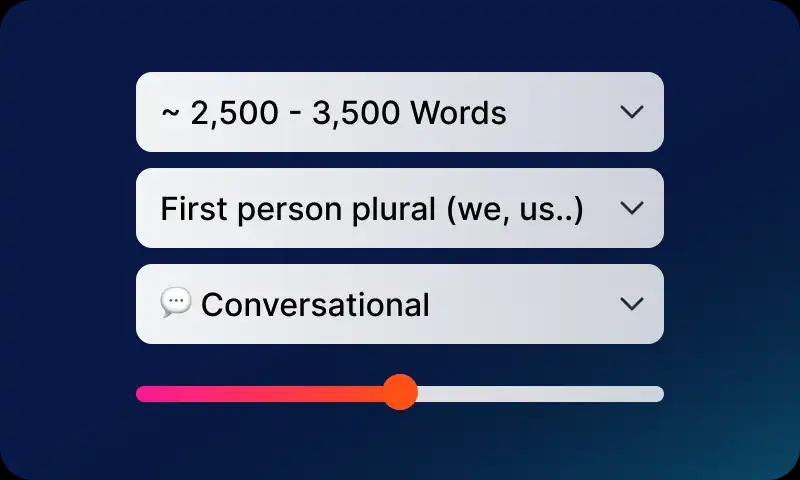 Take full control of the content writing process by customizing the outline to meet your specific requirements and preferences. Choose your preferred Point of View, word count, tone of voice, and adjust creativity and readability levels to create content that resonates with your audience.