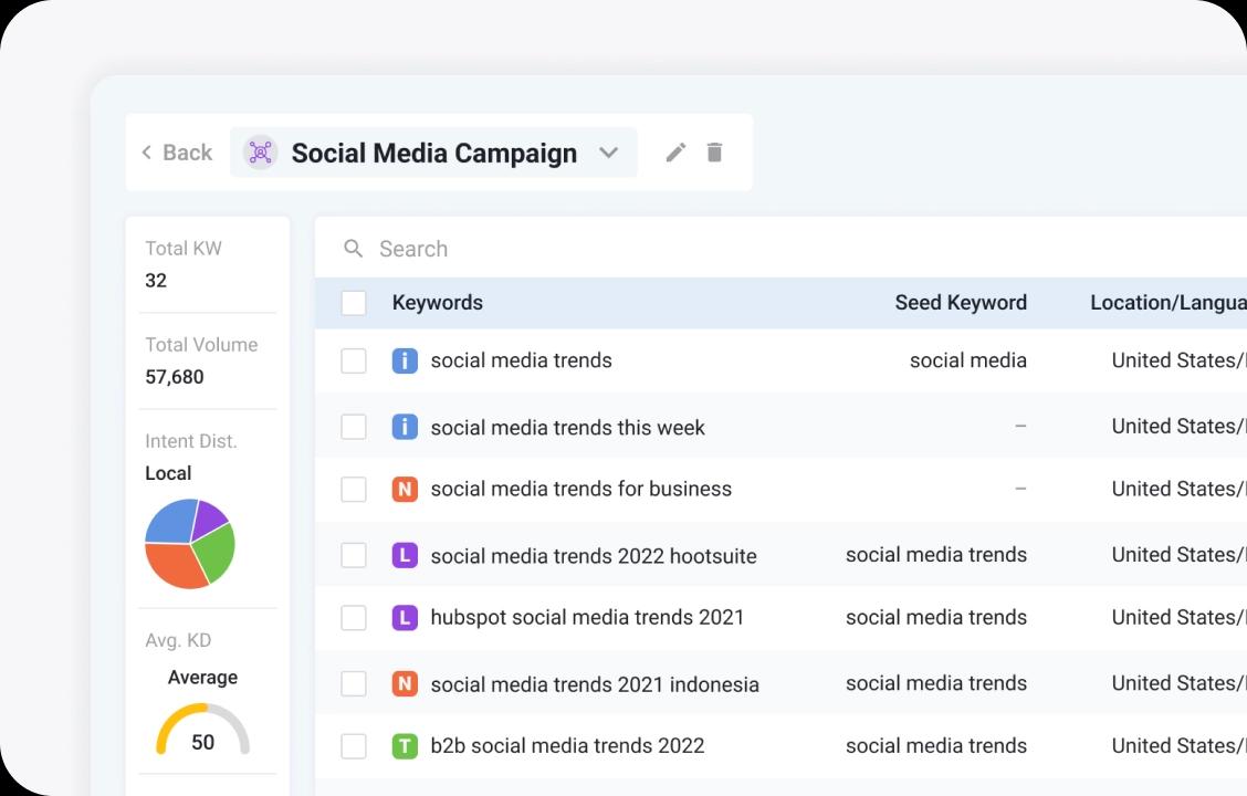 See all your favorite keywords alongside key SEO metrics like search intent, volume and difficulty.