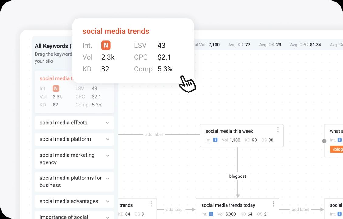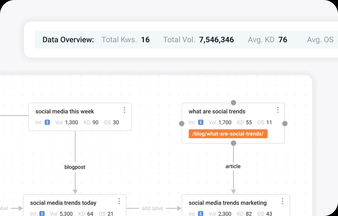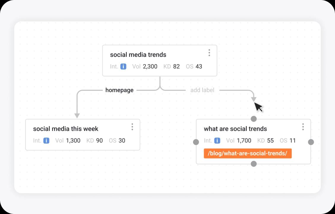 Quickly iterate on your content silo without having to waste hours on spreadsheets. Layout your keywords as relationship links; think of it as a mindmap for your keywords!