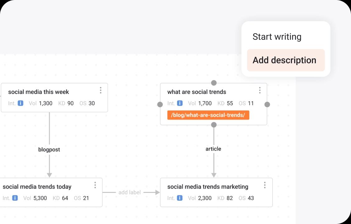 Never miss any important ideas and plans with Keyword Mapper’s extensive annotation toolset. Add a description to each keyword and label every connection.